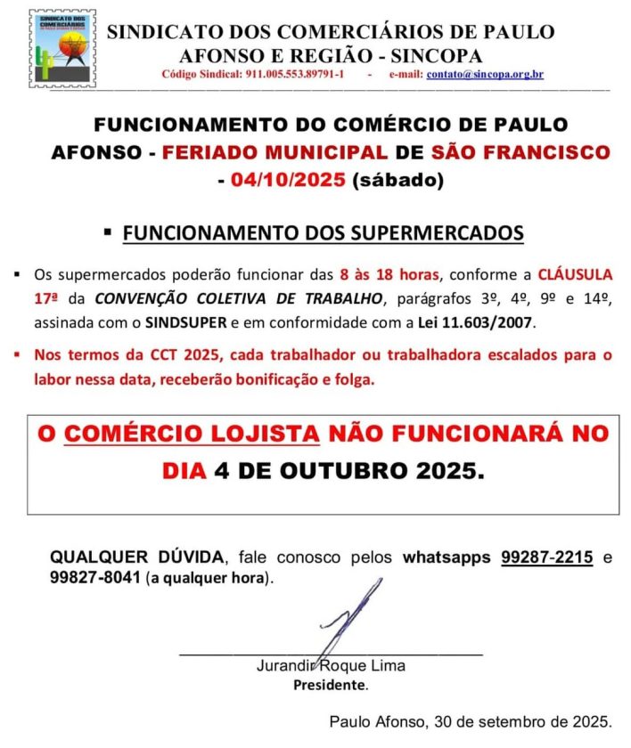 O presidente do Sindicato do Comércio de Paulo Afonso (Sincopa), Jurandir Roque Lima, reforçou que em caso de dúvidas os empresários e trabalhadores podem entrar em contato pelos telefones (75) 99287-2215 ou (75) 99827-8041.