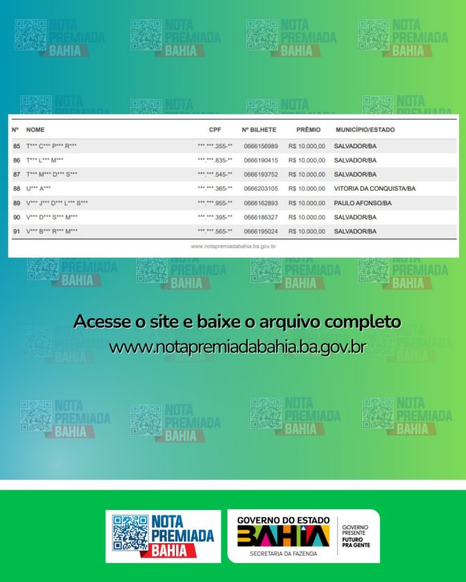 A lista nominal dos ganhadores do mês pode ser consultada no site oficial da campanha e nas redes sociais da Sefaz-BA: Instagram @notapremiadabahia e @sefazbahia, Facebook @sefaz.govba e X (antigo Twitter) @sefazbahia. A relação de sorteados também está disponível no portal da Nota Premiada Bahia, na área dedicada aos resultados.