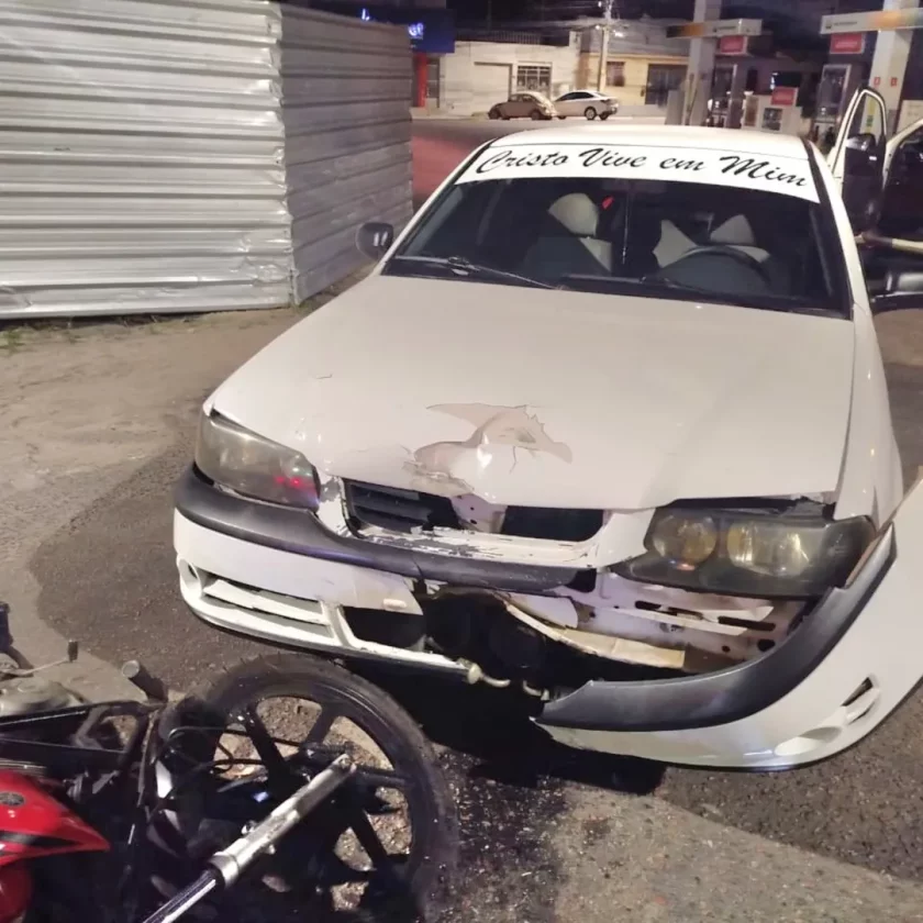 A colisão envolveu uma motocicleta e um carro. Apesar do impacto, não houve registro de vítimas, mas a frente do carro ficou bastante danificada.