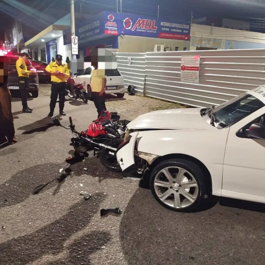 A colisão envolveu uma motocicleta e um carro. Apesar do impacto, não houve registro de vítimas, mas a frente do carro ficou bastante danificada.