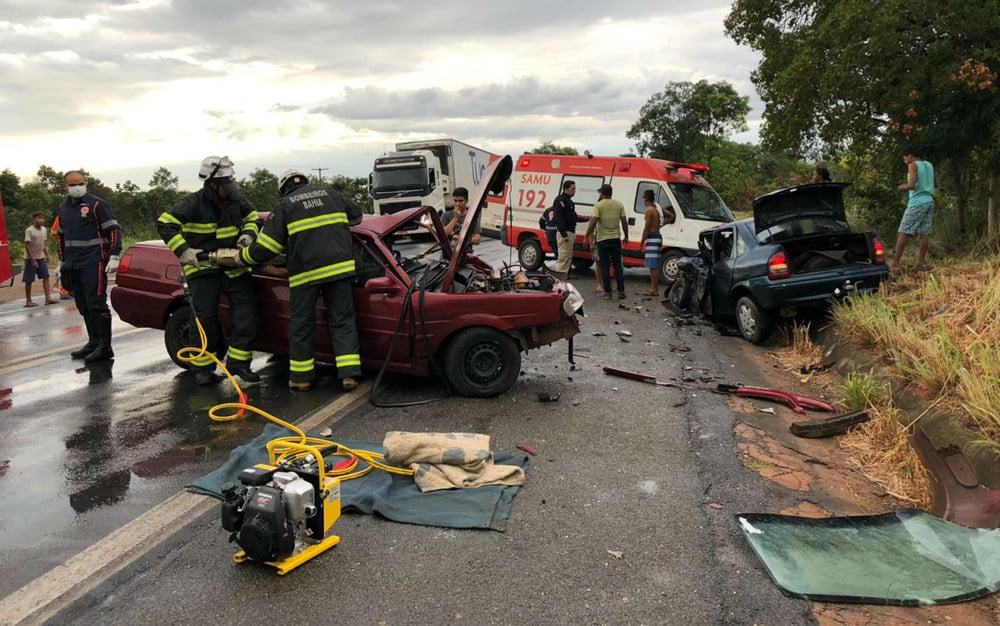 Batida entre dois carros deixa oito pessoas feridas na Bahia; uma ficou presa às ferragens