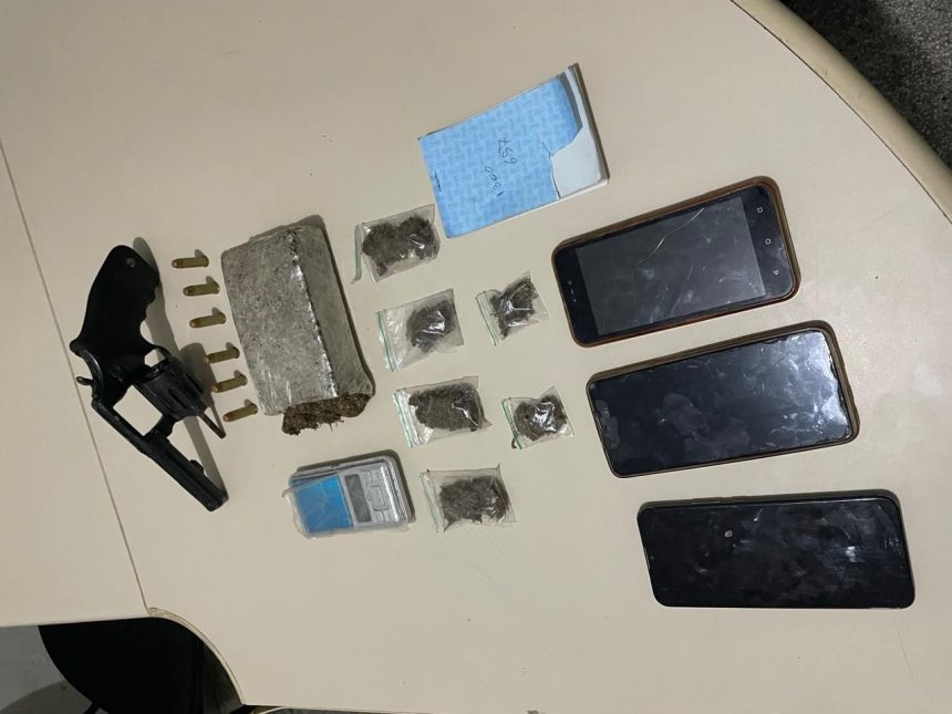 Segundo a ocorrência, os policiais encontraram 1 revólver calibre .38, de numeração 737704, além de 6 munições calibre .38 intactas. Foram apreendidas ainda 1 porção grande de substância análoga à maconha, pesando aproximadamente 550 gramas, e 6 porções pequenas do mesmo entorpecente, com cerca de 33 gramas somadas. Também foram recolhidos 1 celular Multilaser, de cor preta, e 1 celular Motorola, de cor cinza.