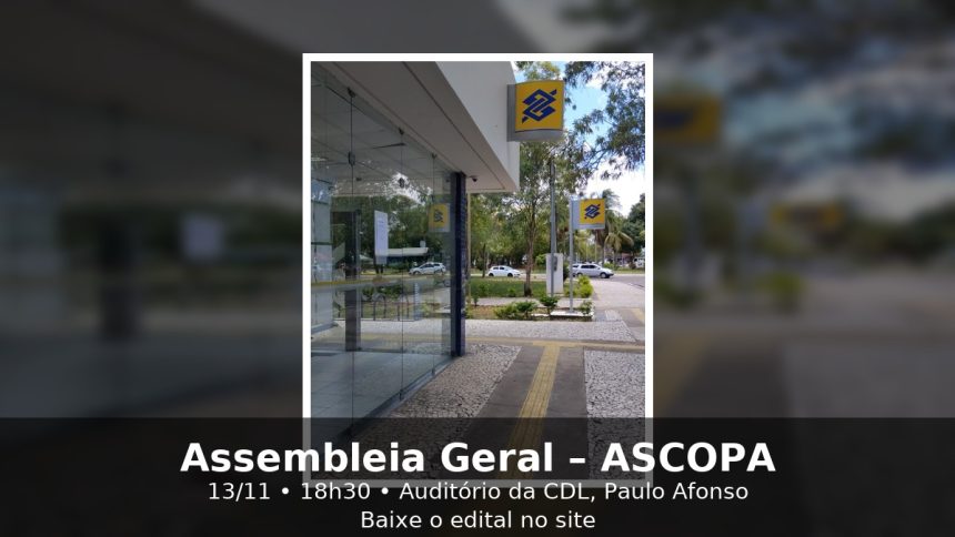 Edital de convocação ASCOPA convoca empresários, comerciantes, prestadores de serviços e demais interessados para a Assembleia Geral Extraordinária que acontecerá em 13 de novembro de 2025, às 18h30, no Auditório da CDL (Rua Monsenhor Magalhães, 214, Centro), em Paulo Afonso (BA). O encontro marca a etapa formal de reativação da Associação Comercial de Paulo Afonso (ASCOPA), com apresentação de proposta de atuação e eleição da nova Diretoria Executiva e dos Conselhos. Edital_de_convocacao_assinado